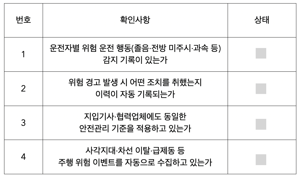 상황: 중견 물류사가 운전기사 120명을 관리하지만, 개별 기사의 운전 습관·위험 행동 기록을 체계적으로 관리하지 않음. 블랙박스는 있으나 사고 발생 시에만 확인.