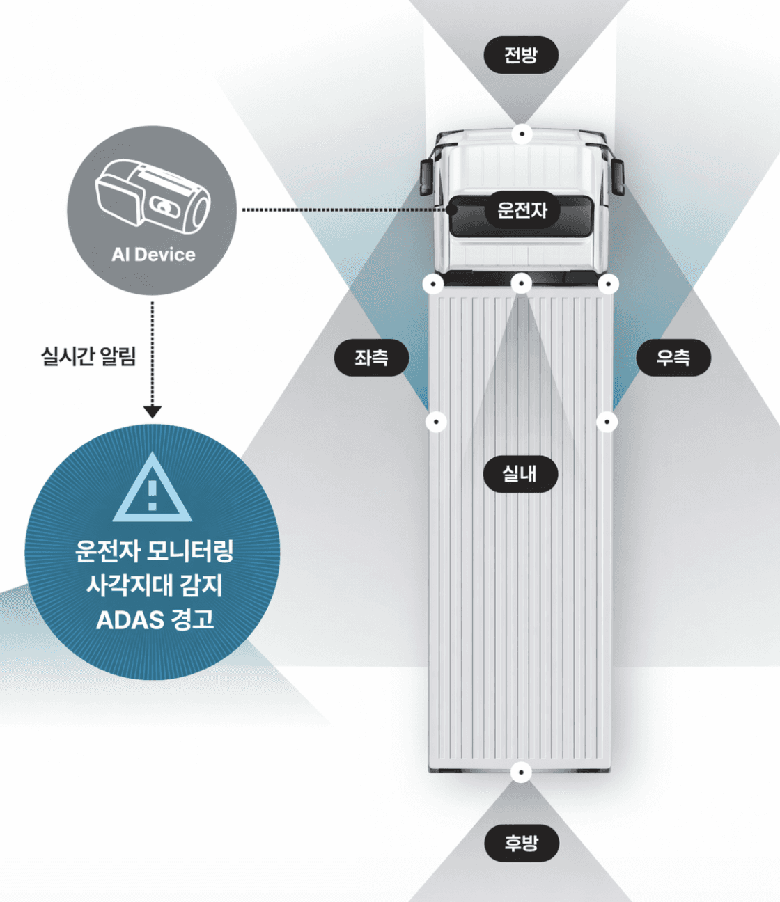 예를 들어 사각지대에서 보행자가 접근하거나, 이륜차가 끼어들거나, 차선 이탈이나 근접 위험이 발생하는 순간을 AI가 감지하고, 그 즉시 운전자에게 경고를 제공합니다.